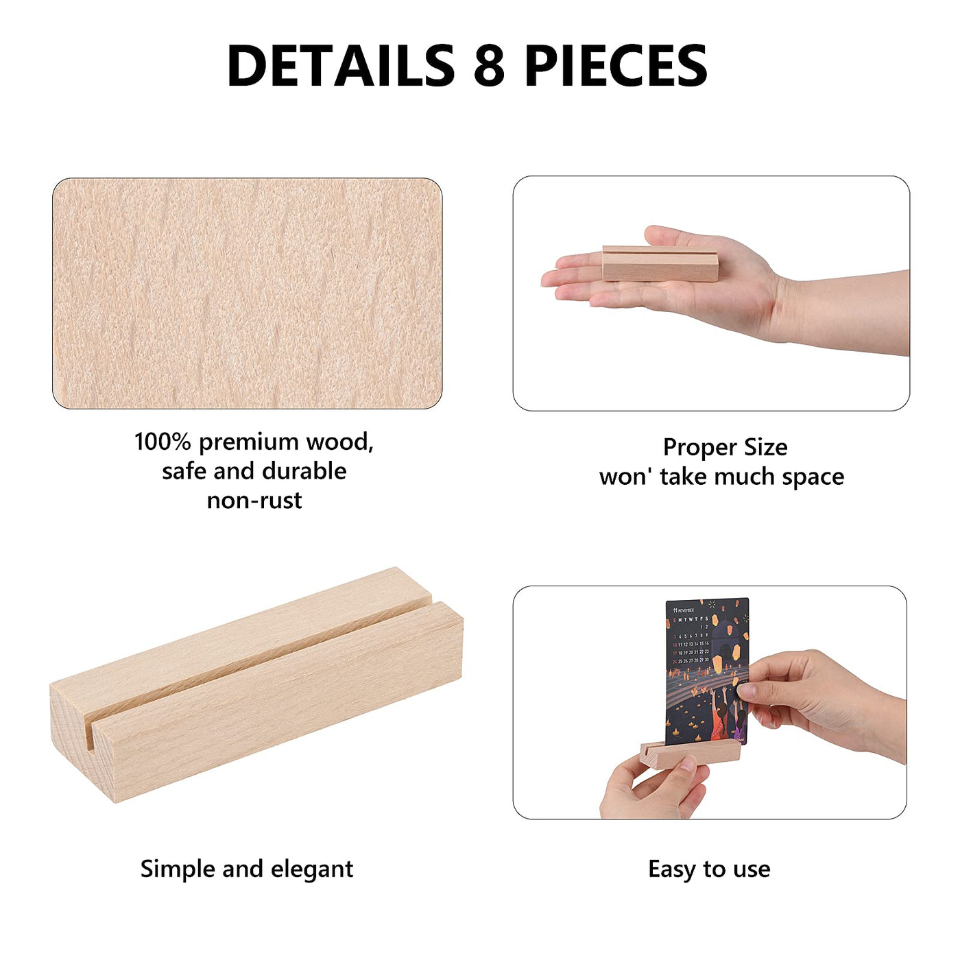 8 Pieces Wood Place Card Holders Table Number Holders Rustic Table Number Stands Wooden Sign Holders For Wedding Party Table Decoration Elegant Appearance: Our Wood Place Card Holders For Table Are Simple And Has Fine Texture, The Wooden Table Number Stands Can Add A Natural, Minimalist Touch, Bring Your Party A Rustic And Forest-Like Atmosphere. Durable Material: The Place Card Holders Is Made Of 100% Natural Wood, Not Like Metal Table Cards, Easy To Rust, Our Wood Picture Clips Is Anti-Rust. The Smooth Surface With Good Texture, Sturdy And Durable, Can Be Use Again And Again. Specifications: Material: Wood Size Of Table Numbers Sign Holder: 8 X 2.5 X 1.5Cm/ 3.15 X 0.98 X 0.59Inch Depth Of Groove: 8 Mm/ 0.31 Inch Width Of Groove: 2Mm/ 0.08Inch Package Includes: 8 X Place Card Holderswarm Note: 1.Please Do Not Insert The Card Above 2Mm Thickness And 16Cm High. 2.Please Do Not Insert The Card Above 16Cm High.