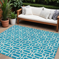8' X 10' Turquoise And Ivory Geometric Washable Indoor Outdoor Area Rug