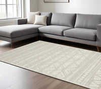 Add some artistry to your room with this 8-foot x 11-foot beige tribal power loom area rug. This rectangle shaped rug features a tribal design in beige to give it visual interest. A classic shape marries with good looking design for your space the coloring of this rug adds a delightfully neutral tone to your home and will easily match with most any decor. Ideal for spaces with kids and pets, this rug is stain resistant to help repel stains and spilled liquids. Place this area rug against a hardwood or tile floor and it will enliven your living space with style and sophistication. 94.49-inch H x 129.92-inch W x 0.32-inch D