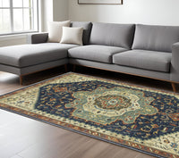 This 8-foot x 11-foot blue oriental power loom area rug with fringe, is a great way to add warmth to a room. This rectangle shaped rug features a oriental design in blue to give it visual interest. A classic shape marries with good looking design for your space ideal for spaces with kids and pets, this rug is stain resistant to help repel stains and spilled liquids. Tassel ends bring a timeless and fashionable look to your interior. Area rugs help to give warmth and sense of home to your space. 94.49-inch H x 133.86-inch W x 0.32-inch D