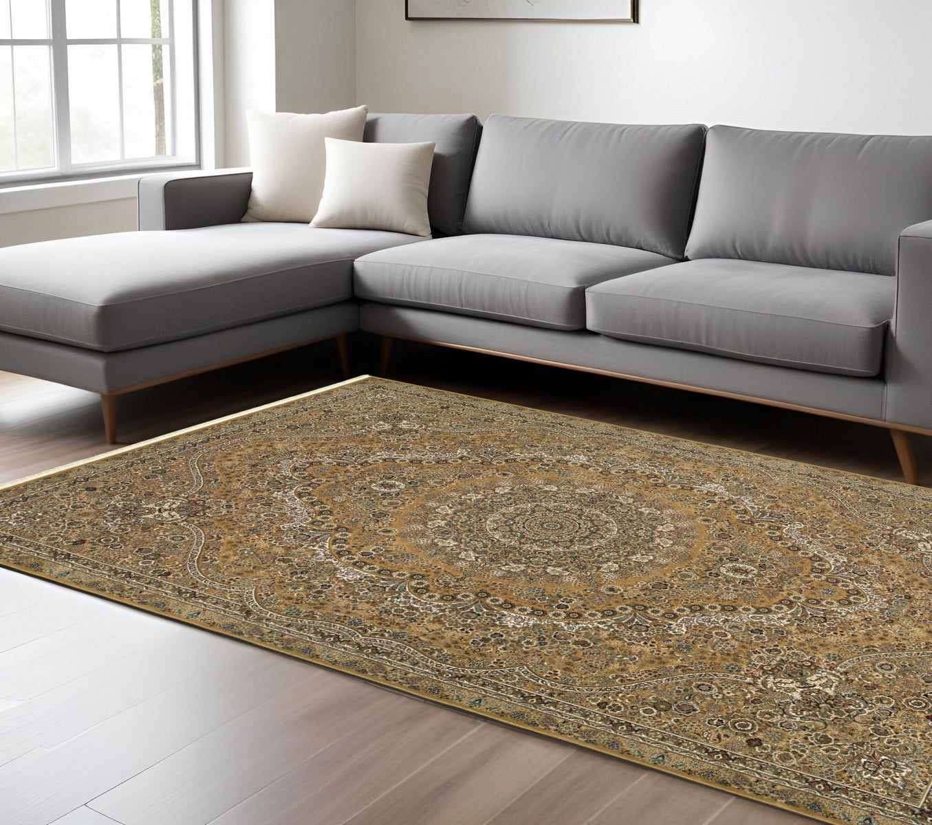 Add some artistry to your room with this 8-foot x 11-foot gold medallion power loom area rug with fringe. This rectangle shaped rug features a medallion design in gold to give it visual interest. A classic shape marries with good looking design for your space ideal for spaces with kids and pets, this rug is stain resistant to help repel stains and spilled liquids. Tassel ends bring a timeless and fashionable look to your interior. Place this area rug against a hardwood or tile floor and it will enliven your living space with style and sophistication. 94.49-inch H x 129.92-inch W x 0.16-inch D