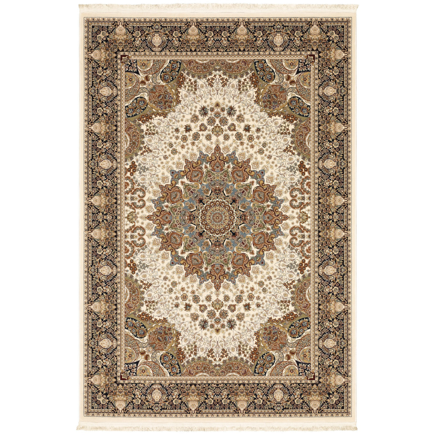 8' X 11' Ivory Black And Tan Medallion Area Rug With Fringe