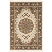 Add great coloration and comfortable texture to your space with this 8-foot x 11-foot ivory medallion power loom area rug with fringe. This rectangle shaped rug features a medallion design in ivory to give it visual interest. A classic shape marries with good looking design for your space the coloring of this rug adds a delightfully neutral tone to your home and will easily match with most any decor. Ideal for spaces with kids and pets, this rug is stain resistant to help repel stains and spilled liquids. Tassel ends bring a timeless and fashionable look to your interior. Place this area rug against a hardwood or tile floor and it will enliven your living space with style and sophistication. 94.49-inch H x 129.92-inch W x 0.16-inch D