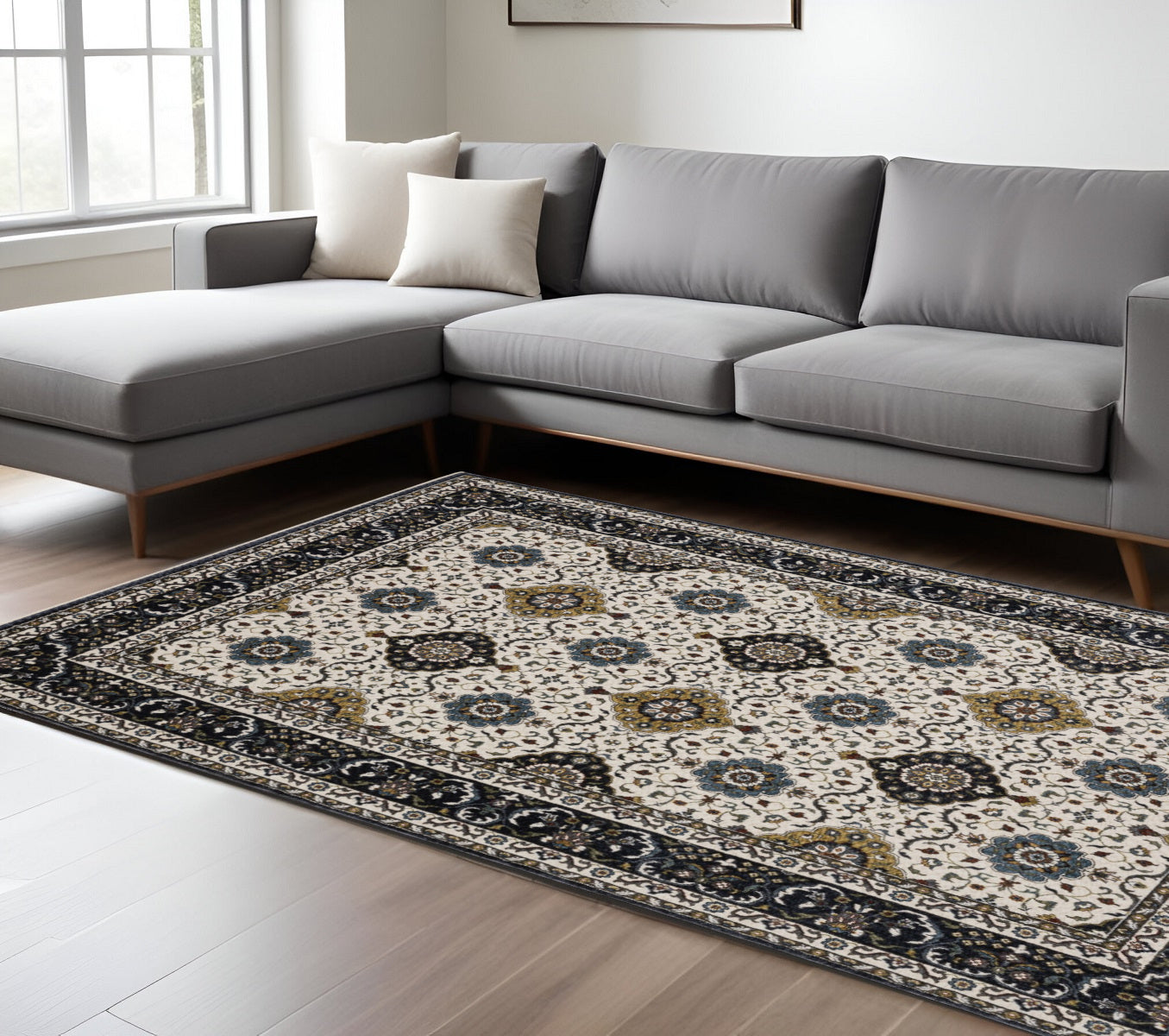 Add great coloration and comfortable texture to your space with this 8-foot x 11-foot ivory medallion power loom area rug with fringe. This rectangle shaped rug features a medallion design in ivory to give it visual interest. A classic shape marries with good looking design for your space the coloring of this rug adds a delightfully neutral tone to your home and will easily match with most any decor. Ideal for spaces with kids and pets, this rug is stain resistant to help repel stains and spilled liquids. Tassel ends bring a timeless and fashionable look to your interior. Place this area rug against a hardwood or tile floor and it will enliven your living space with style and sophistication. 94.49-inch H x 133.86-inch W x 0.47-inch D