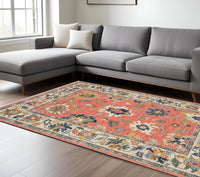 8' X 11' Salmon Blue And Yellow Oriental Area Rug With Fringe