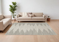 This 8-foot x 12-foot gray and ivory ombre hand woven area rug, is a great way to add warmth to a room. Crafted by skilled artisans, this hand woven rug is genuine and unique. No two will be exactly alike. Crafted from wool blend fibers that give this piece premium texture, refinement, and appeal. This rectangle shaped rug features a ombre design that will add a functional and decorative accent to your space. This larger sized rug is ideal to create a focal point or statement piece in your room. 102-inch h x 138-inch w x 0.47-inch d