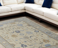 8' X 12' Gray Ivory and Blue Wool Floral Hand Knotted Area Rug With Fringe
