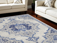 8' X 12' Ivory and Blue Floral Medallion Distressed Non Skid Area Rug