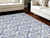 8' X 12' Ivory and Navy Blue Damask Distressed Non Skid Area Rug