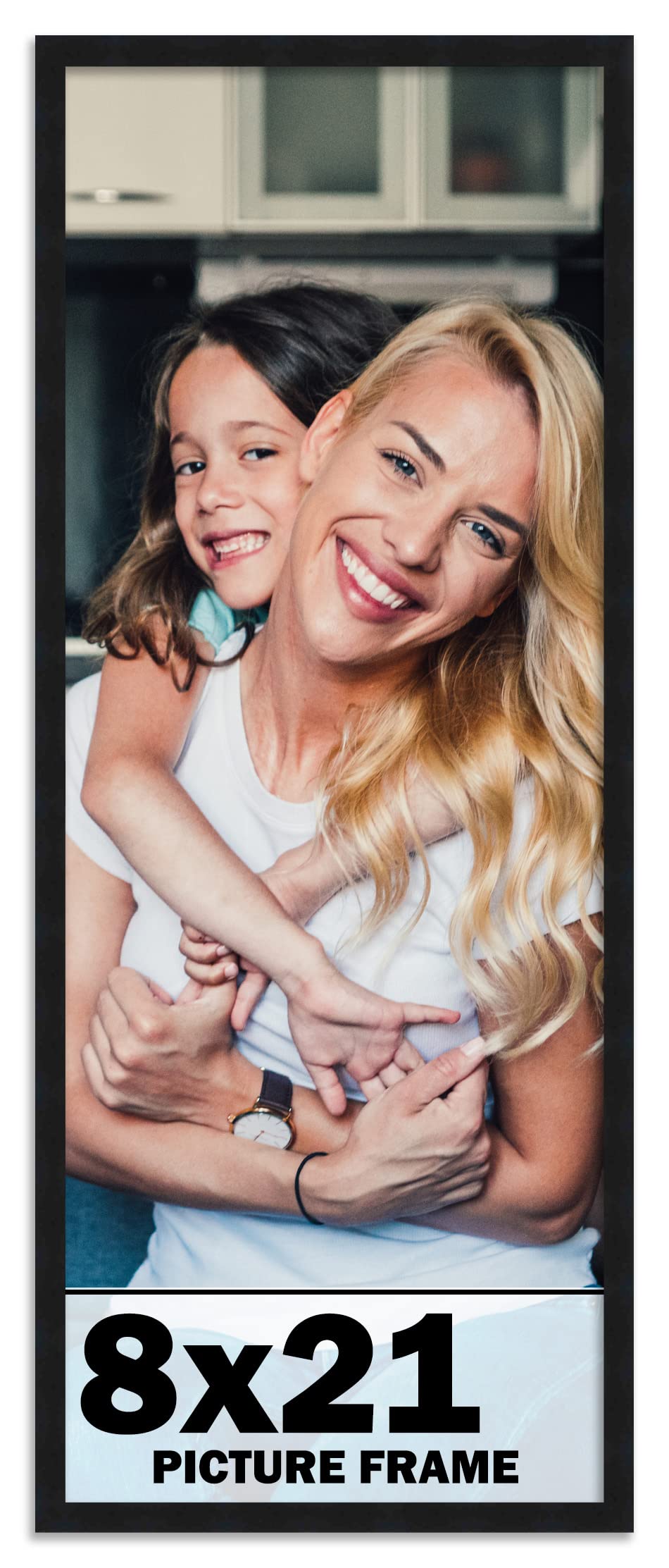 Q: What size photos can I display in the 8x21 Frame?A: The 8x21 Frame is designed to accommodate artwork, photos, documents, and other media measuring exactly 8x21 inches, making it perfect for a variety of uses including family photos and diplomas.