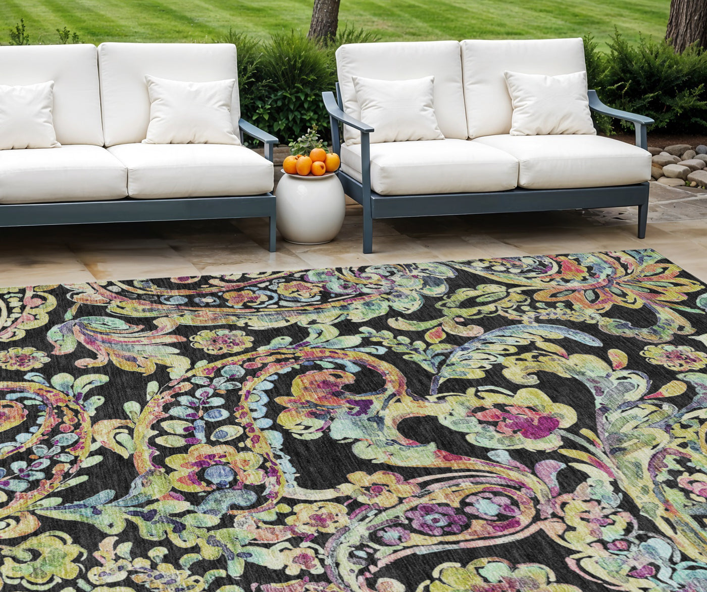 Set an inviting tone in your space with this 9-foot x 12-foot black and artichoke green paisley washable indoor outdoor area rug. This rectangle shaped rug features a paisley design that will work well both indoors or out. A classic shape marries with good looking design for your living room, hall, bedroom, porch, patio, or poolside. The coloration of this rug infuses an updated and modern vibe into your space. Ideal for outdoor spaces or high traffic areas with kids and pets, this rug is made from heavy duty polyester that is stain resistant to help repel water, dirt, and stains. Versatile in use, durable, and easy to maintain, this rug is an ideal solution to add a decorative and inviting touch to your indoor or outdoor space. 108-inch h x 144-inch w x 0.19-inch d.