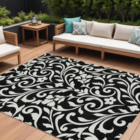 9' X 12' Black And Ivory Floral Washable Indoor Outdoor Area Rug