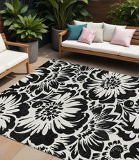 9' X 12' Black And Ivory Floral Washable Non Skid Indoor Outdoor Area Rug