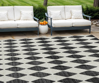 Set an inviting tone in your space with this 9-foot x 12-foot black geometric washable indoor outdoor area rug. This rectangle shaped rug features a geometric design that will work well both indoors or out. A classic shape marries with good looking design for your living room, hall, bedroom, porch, patio, or poolside. The coloration of this rug infuses an updated and modern vibe into your space. Ideal for outdoor spaces or high traffic areas with kids and pets, this rug is made from heavy duty polyester that is stain resistant to help repel water, dirt, and stains. Makes a great way to dress up your patio, porch, or poolside, but also works well as a durable and easy to maintain option in the kitchen, family room, or mudroom. 108-inch h x 144-inch w x 0.19-inch d.