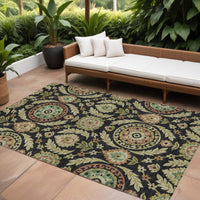 9' X 12' Black Gold And Copper Floral Washable Indoor Outdoor Area Rug