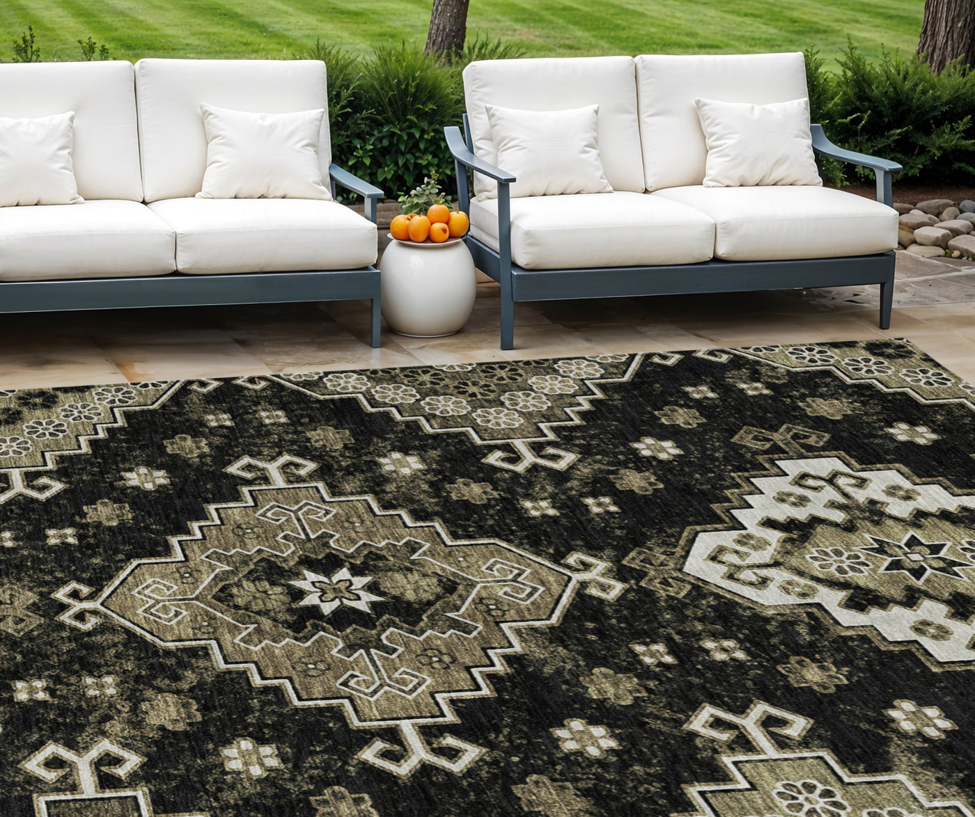 Add great coloration and comfortable texture to your space with this 9-foot x 12-foot black ivory and taupe medallion washable indoor outdoor area rug. This rectangle shaped rug features a medallion design that will work well both indoors or out. A classic shape marries with good looking design for your living room, hall, bedroom, porch, patio, or poolside. The coloration of this rug infuses an updated and modern vibe into your space. Ideal for outdoor spaces or high traffic areas with kids and pets, this rug is made from heavy duty polyester that is stain resistant to help repel water, dirt, and stains. Makes a great way to dress up your patio, porch, or poolside, but also works well as a durable and easy to maintain option in the kitchen, family room, or mudroom. 108-inch h x 144-inch w x 0.19-inch d.