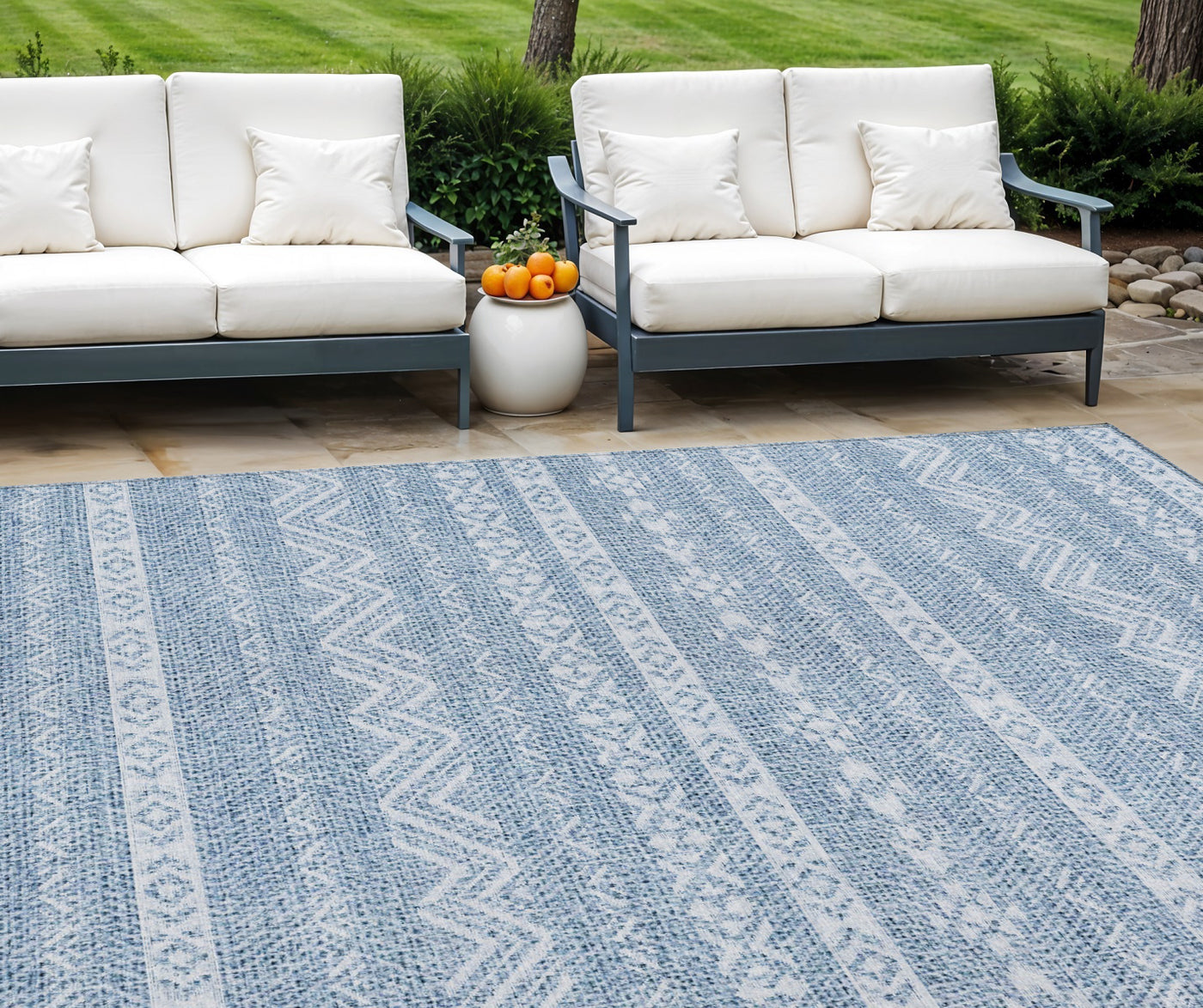 Set an inviting tone in your space with this 9-foot x 12-foot blue and denim blue southwestern washable indoor outdoor area rug. This rectangle shaped rug features a southwestern design that will work well both indoors or out. A classic shape marries with good looking design for your living room, hall, bedroom, porch, patio, or poolside. Ideal for outdoor spaces or high traffic areas with kids and pets, this rug is made from heavy duty polyester that is stain resistant to help repel water, dirt, and stains. Makes a great way to dress up your patio, porch, or poolside, but also works well as a durable and easy to maintain option in the kitchen, family room, or mudroom. 108-inch h x 144-inch w x 0.19-inch d.