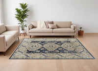9' X 12' Blue and Ivory Wool Geometric Hand Knotted Area Rug With Fringe