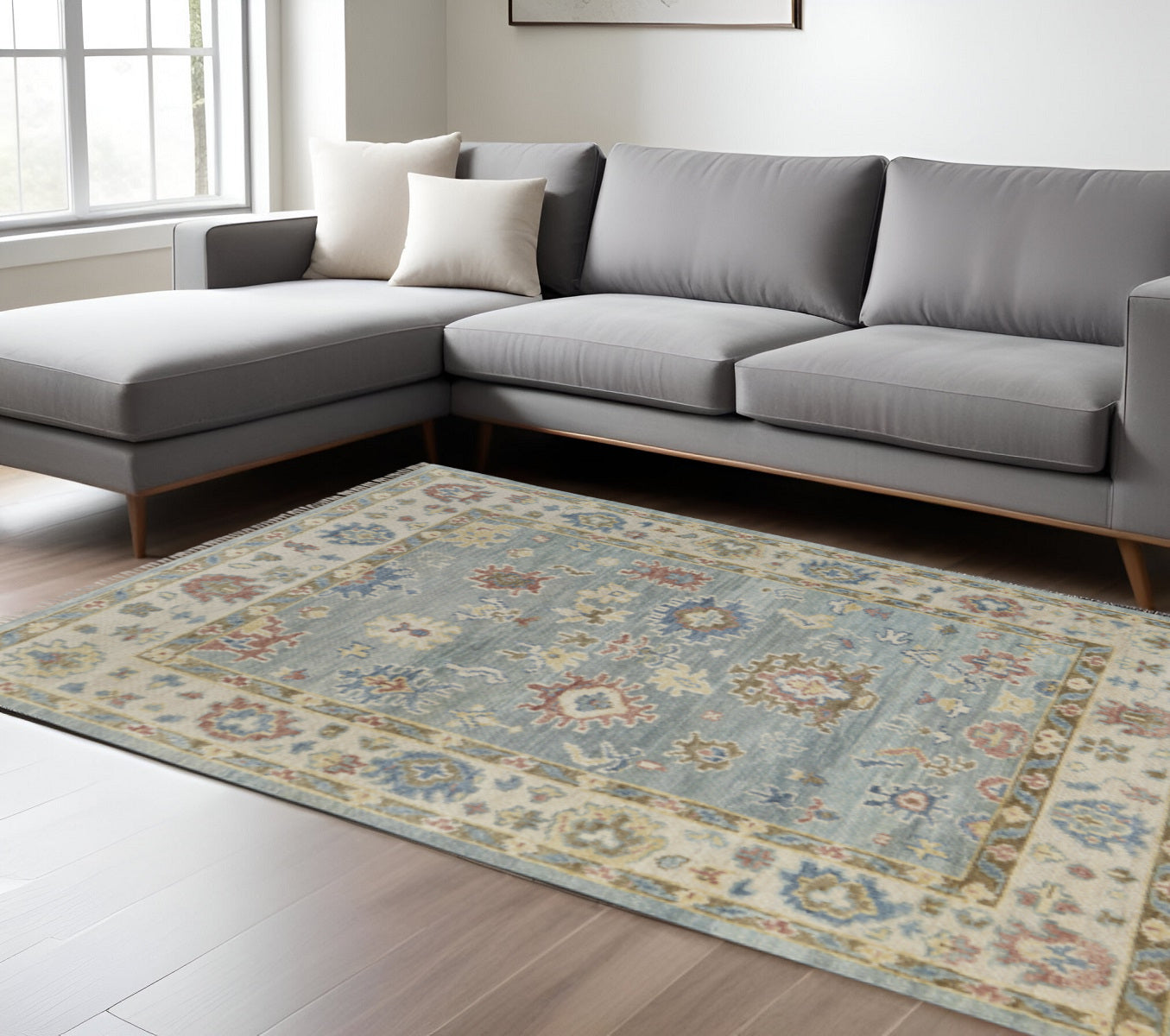 9' X 12' Blue Ivory And Yellow Floral Hand Knotted Area Rug With Fringe