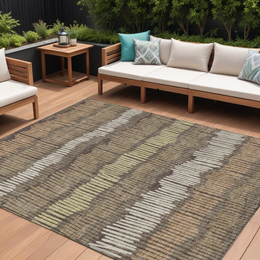 9' X 12' Brown And Dark Green Striped Washable Indoor Outdoor Area Rug