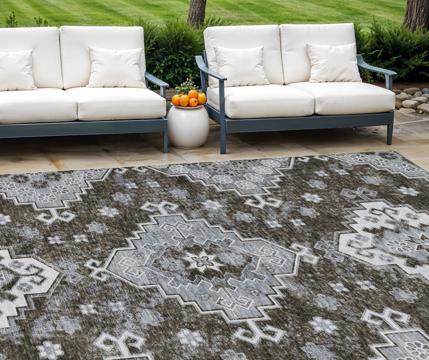 9' X 12' Brown And Gray Medallion Washable Indoor Outdoor Area Rug