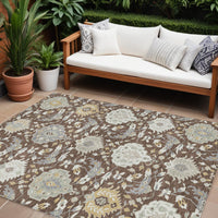 9' X 12' Brown Gray And Ivory Damask Washable Indoor Outdoor Area Rug