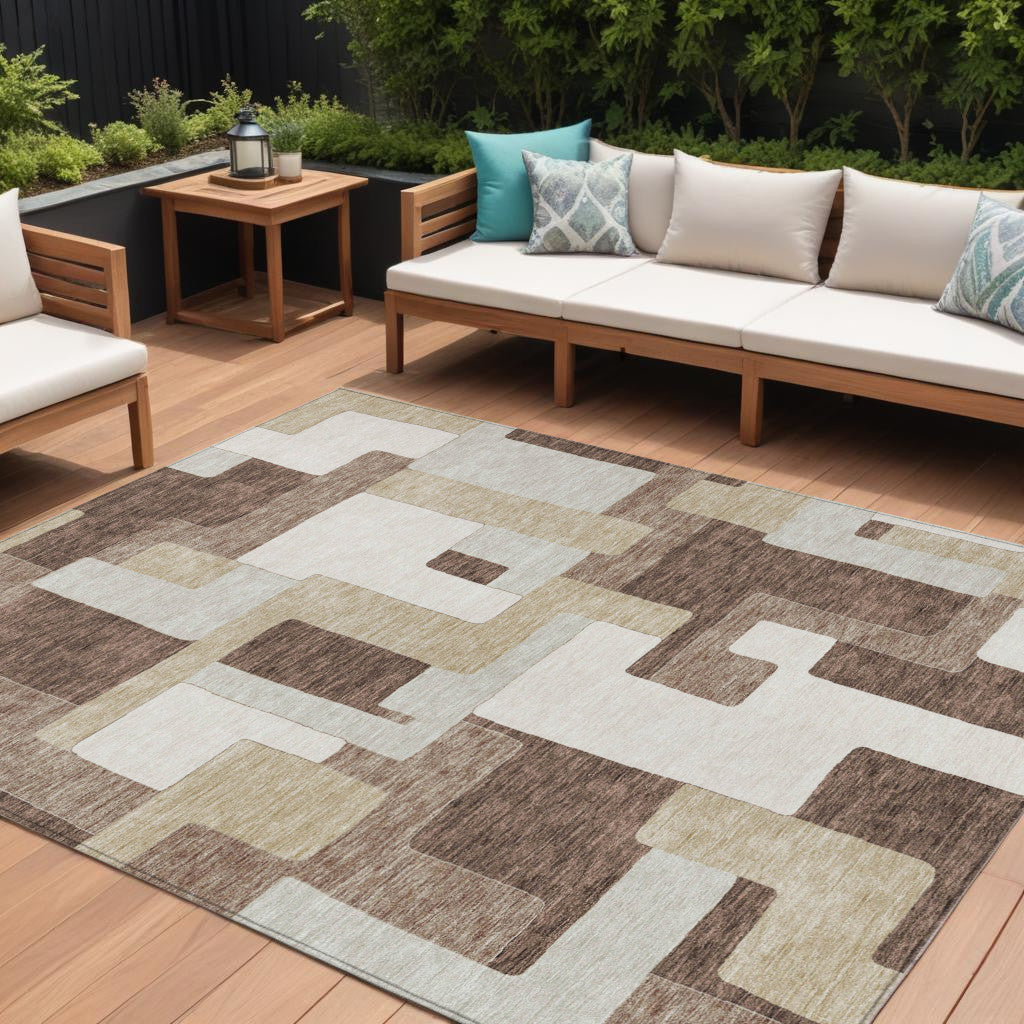 Add some artistry to your room with this 9-foot x 12-foot brown ivory and taupe geometric washable indoor outdoor area rug. This rectangle shaped rug features a geometric design that will work well both indoors or out. A classic shape marries with good looking design for your living room, hall, bedroom, porch, patio, or poolside. Ideal for outdoor spaces or high traffic areas with kids and pets, this rug is made from heavy duty polyester that is stain resistant to help repel water, dirt, and stains. Makes a great way to dress up your patio, porch, or poolside, but also works well as a durable and easy to maintain option in the kitchen, family room, or mudroom. 108-inch h x 144-inch w x 0.19-inch d.