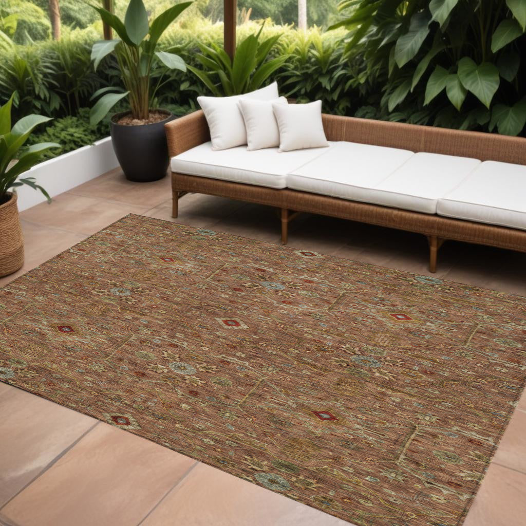 9' X 12' Brown Red And Green Floral Washable Indoor Outdoor Area Rug