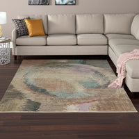 Set an inviting tone in your space with this 9-foot x 12-foot brown tan and blue abstract distressed area rug. Ideal for spaces with kids and pets, this rug is stain resistant to help repel dirt and spilled liquids. Built to last, this rug crafted from polypropylene blend fibers is known for its durability and long lasting appeal. Rugs are a great way to showcase your style, hide imperfections, warm your home and reduce noise. This larger sized, industrial styled rug is ready to create a focal point or statement piece in your room. 108-inch h x 144-inch w x 0.47-inch d.