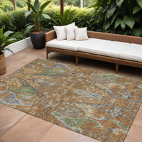 9' X 12' Copper Green And Beige Floral Washable Indoor Outdoor Area Rug