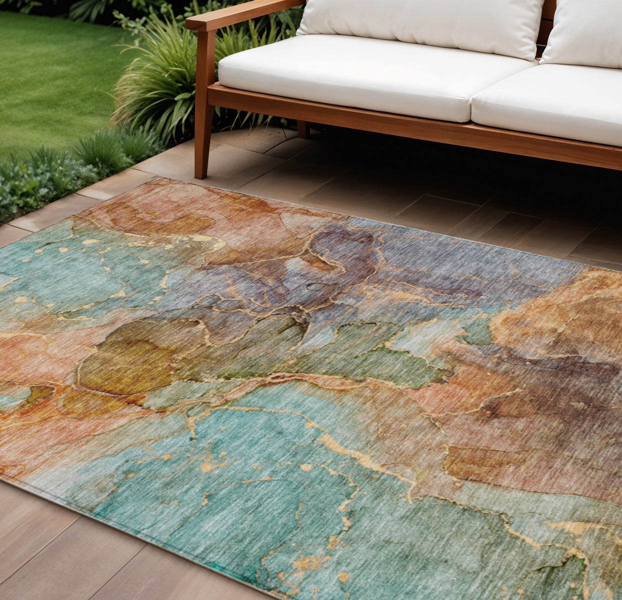 9' X 12' Copper Orange And Teal Blue Abstract Washable Indoor Outdoor Area Rug