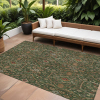 9' X 12' Emerald Brown And Red Floral Washable Indoor Outdoor Area Rug