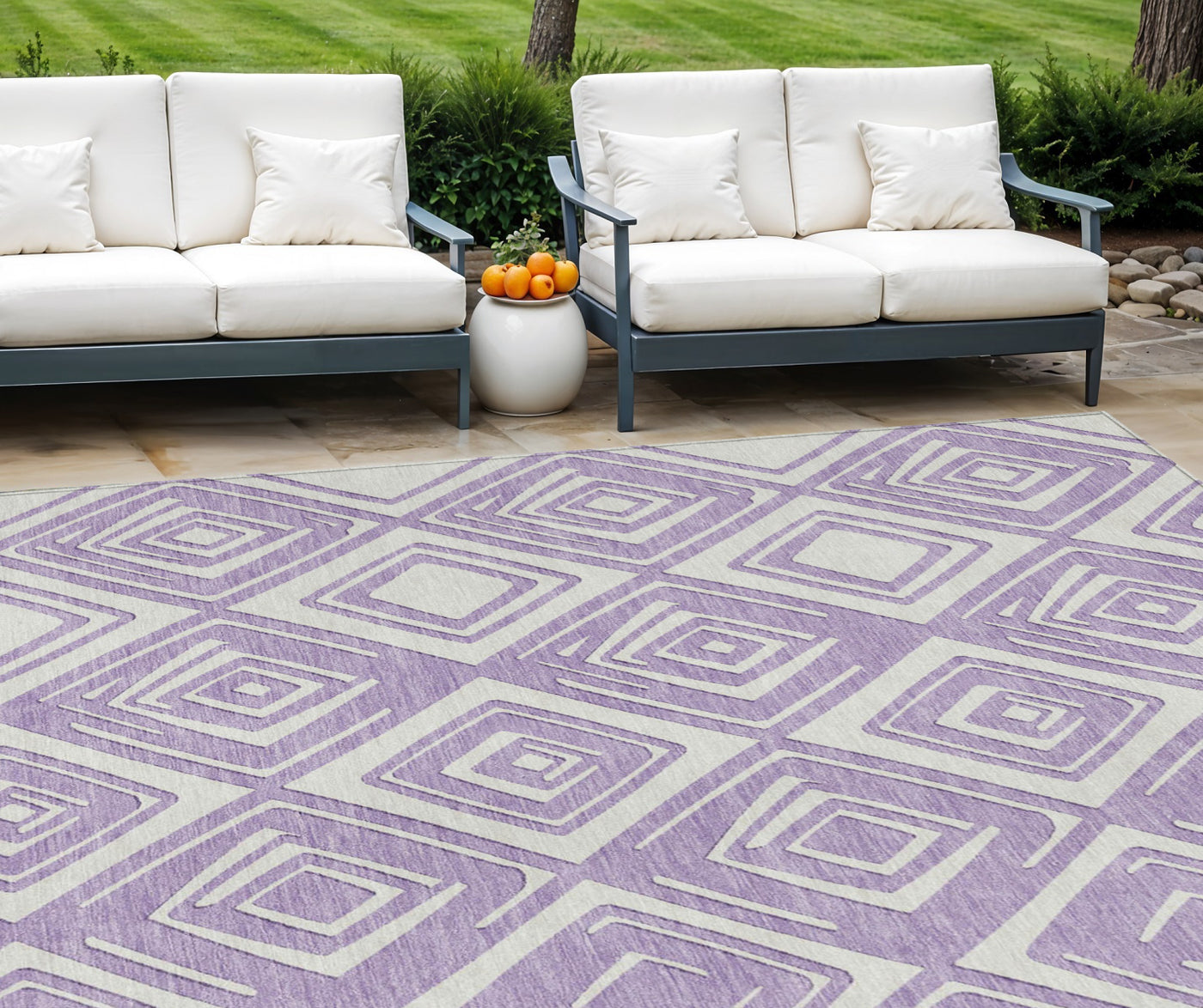 Set an inviting tone in your space with this 9-foot x 12-foot lavender and ivory geometric washable indoor outdoor area rug. This rectangle shaped rug features a geometric design that will work well both indoors or out. A classic shape marries with good looking design for your living room, hall, bedroom, porch, patio, or poolside. Ideal for outdoor spaces or high traffic areas with kids and pets, this rug is made from heavy duty polyester that is stain resistant to help repel water, dirt, and stains. Versatile in use, durable, and easy to maintain, this rug is an ideal solution to add a decorative and inviting touch to your indoor or outdoor space. 108-inch h x 144-inch w x 0.19-inch d.