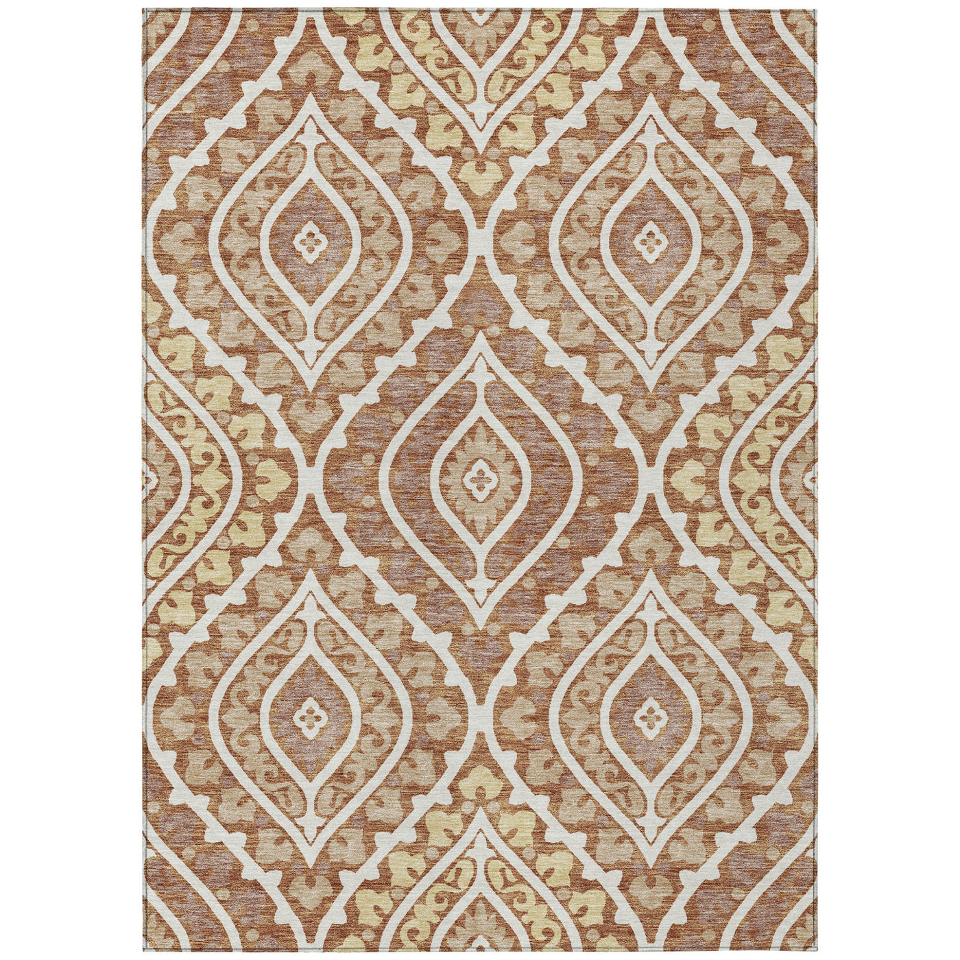 Add great coloration and comfortable texture to your space with this 9-foot x 12-foot orange gold and ivory floral washable indoor outdoor area rug. This rectangle shaped rug features a floral design that will work well both indoors or out. A classic shape marries with good looking design for your living room, hall, bedroom, porch, patio, or poolside. Ideal for outdoor spaces or high traffic areas with kids and pets, this rug is made from heavy duty polyester that is stain resistant to help repel water, dirt, and stains. Versatile in use, durable, and easy to maintain, this rug is an ideal solution to add a decorative and inviting touch to your indoor or outdoor space. 108-inch h x 144-inch w x 0.19-inch d.
