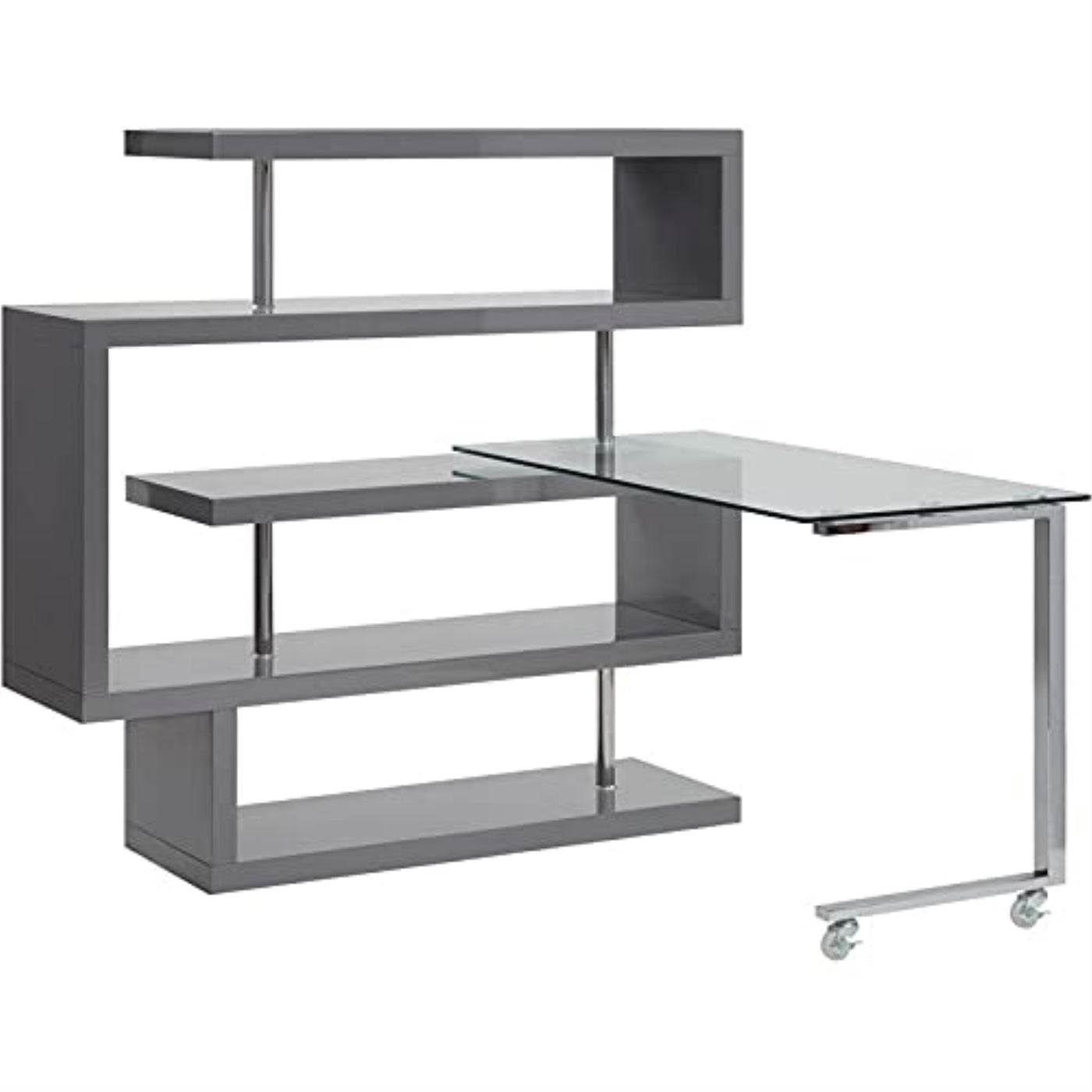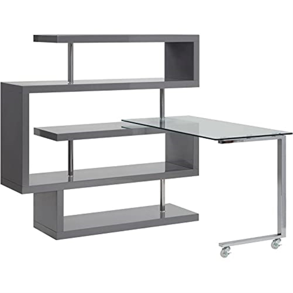 Designed for space-conscious, the Raceloma writing desk with shelves is excellent for those with smaller spaces. The winding S-shaped shelf bookcase instantly transforms any room giving your books and decor a vibrant stage for display. Adding function to the design with a convenient roll-out desk with a sleek glass top, use it as an extra shelf on the bookcase when not in use. This desk makes for a contemporary multi-purpose piece in smaller spaces.