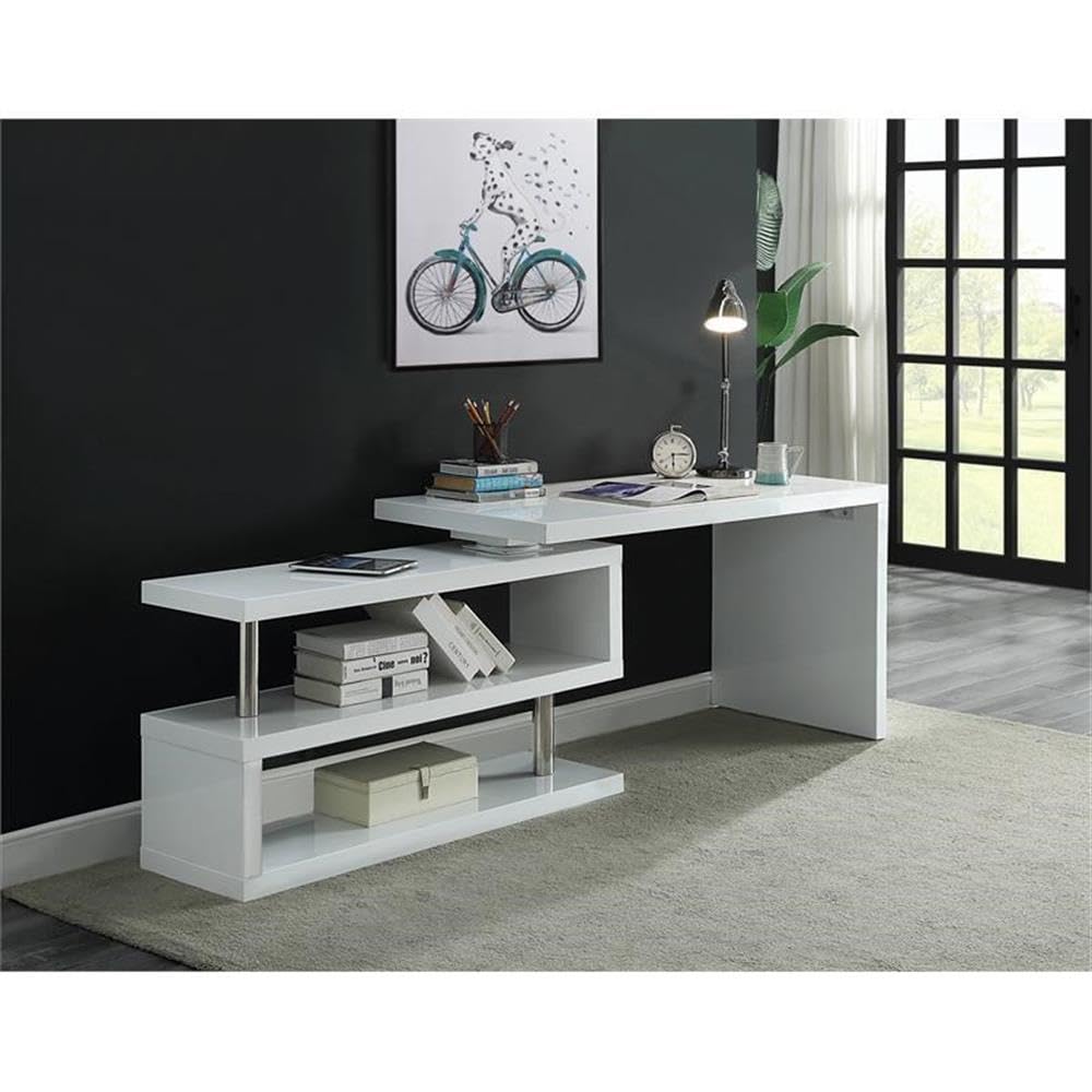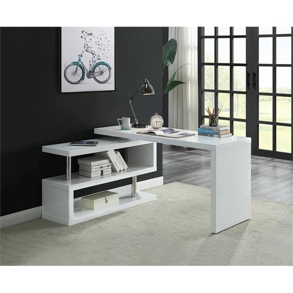 The crisp white finish and shiny stainless steel create a great combination that instantly freshens up your office space. The writing desk features an overall white look and sturdy metal supporting frame, which highlights the modern minimalist design. Its 360-degree swivel design can easily transform an ordinary office into a smart and multi-functional space., The attached two-tier bookshelf provides ample storage with easy access to all of your essentials.