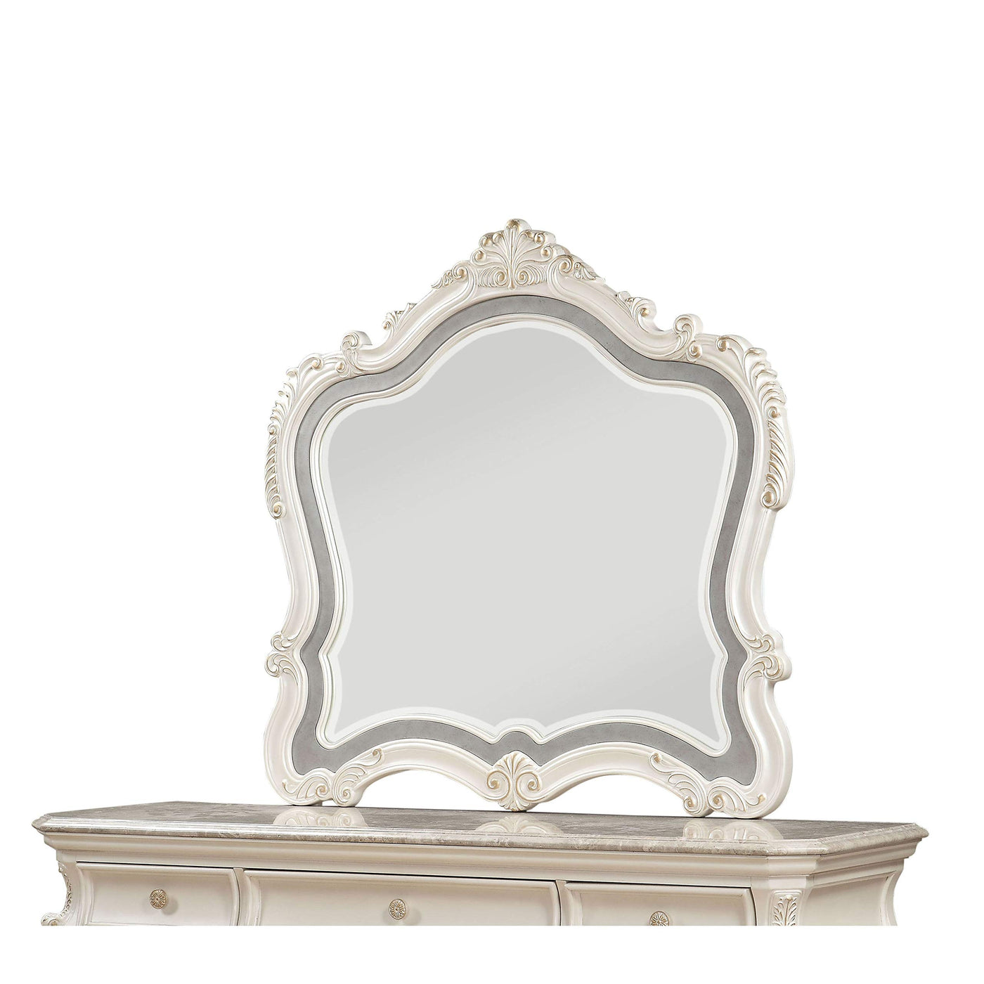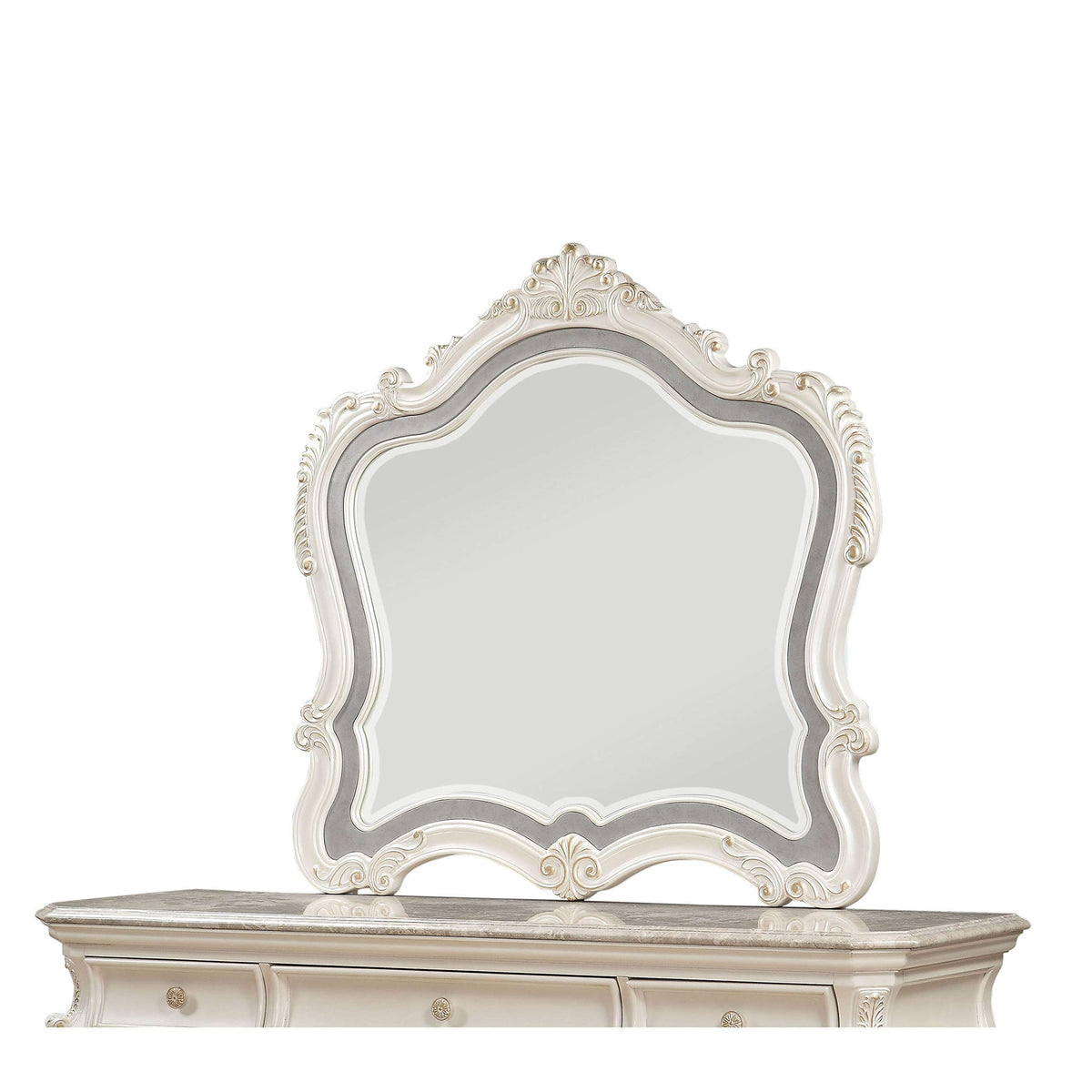 Filled with romantic wonder, the Chantelle French rococo mirror is made to IMPRESS. The versatile and majestic styling of the Chantelle collection allows this grand suite to be a center piece to any decor. The scrolled ornamental trim & crown framed mirror comes with all hardware. Available in Antique Platinum and Pearl White finish. Measures 45" X 2" X 45"H.