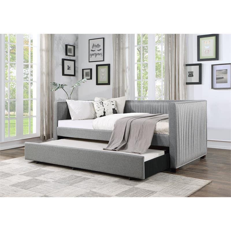 Transform a room into a multipurpose space with this elegant tailored tuxedo-style daybed with trundle combo. Padded all around, this daybed is wrapped in a gray fabric and features channel tufted-inspired pleats that give it a charming textural look and feel. Tucked beneath the top sofa and bed seating area is an extra hidden trundle that slides out effortlessly when you need to accommodate overnight guests. With a clean silhouette and shape, this sophisticated trundle daybed rests elevated on dark finish square feet for a bit of contrast. Place this daybed with trundle in a home office to offer weekend guests and family members a comfortable place to sleep.