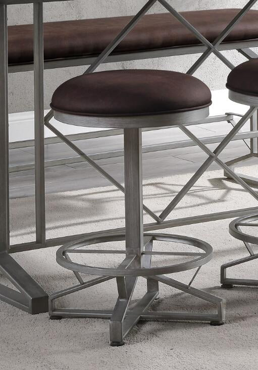 This versatile stool will bring an industrial home bar design into your space. It offers a round seat cushion with rustic brown upholstery for a great texture and feels. Metal cross base with footrest gives the stool extreme support and style. Create an ideal place where friends can sit long enough to share drinks and meals with counter-height stools.