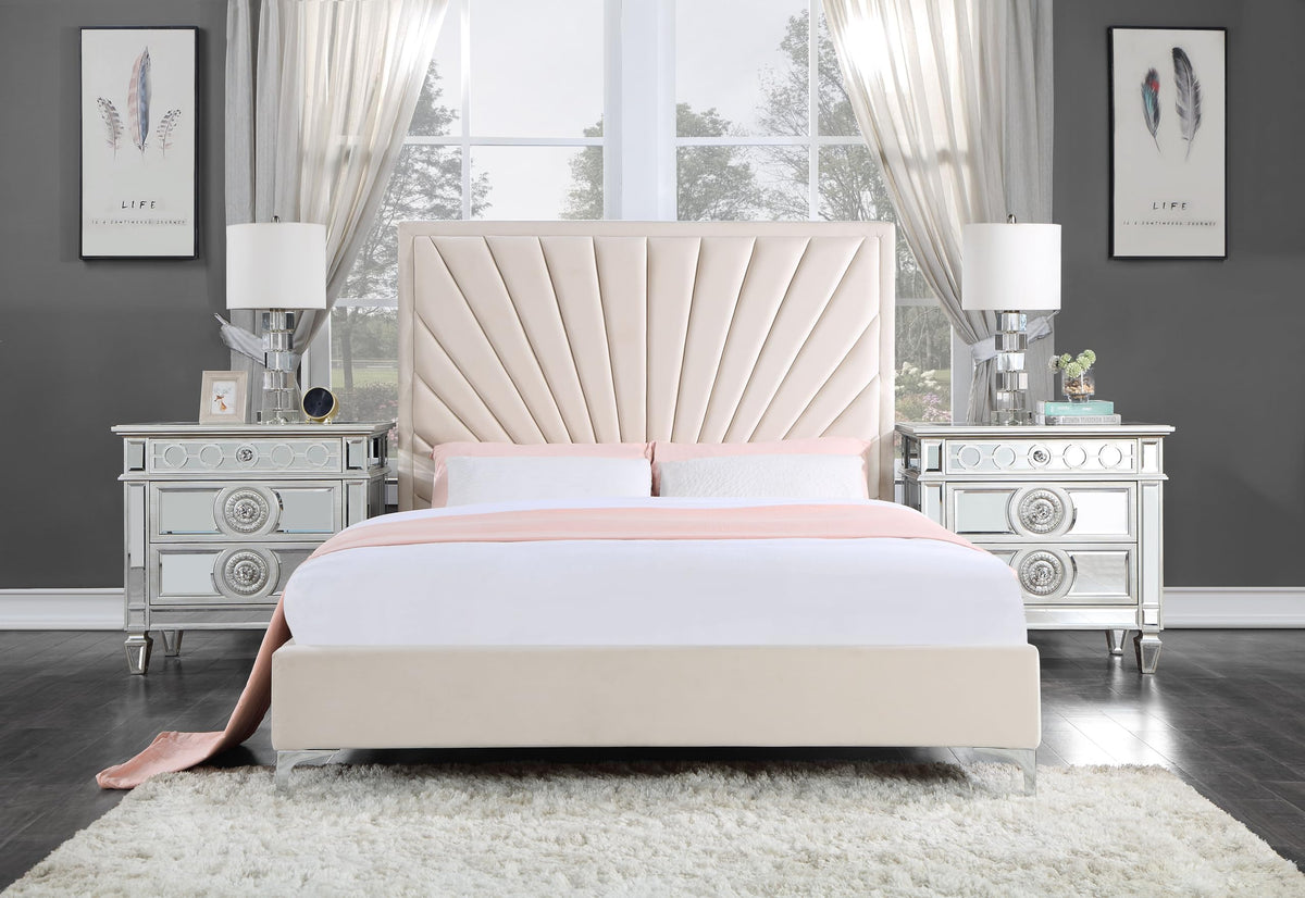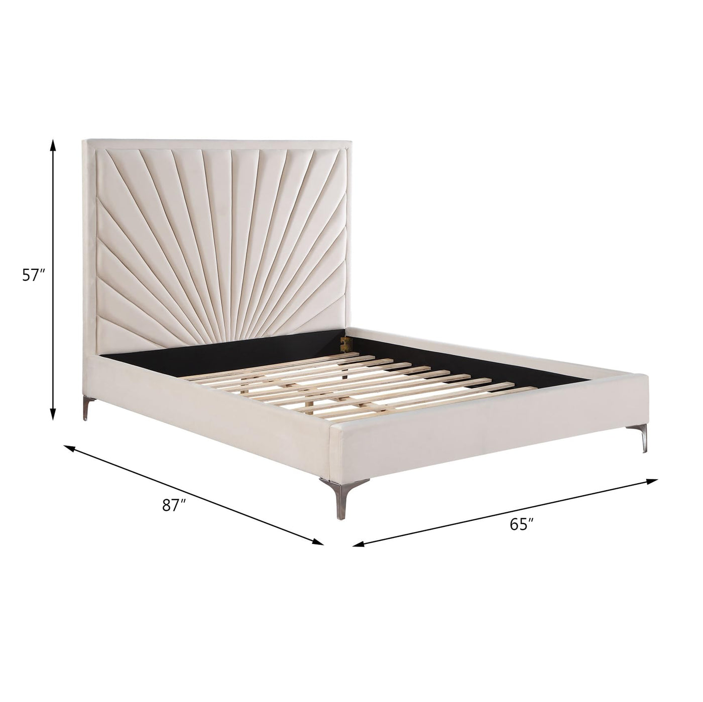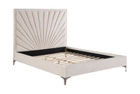 The decadent Faiz beige velvet upholstery looks like it came right out of a home magazine. This prestige bed awaits you with this unique sunburst channel-tufted headboard design to create an eye-catching focal piece in your bedroom. Metal feet provide the bed with ultimate support. No need for a box spring, thirteen slats are included for a stable night's sleep.