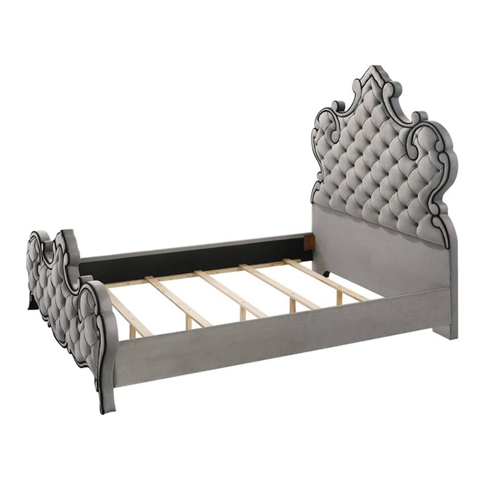 The bed is luxuriously designed and upholstered in sumptuous gray velvet and features black piping. The hardwood wooden frame is designed for long time use. The crown design on the headboard and footboard adds some drama to the bed. Glistening crystal-like button tufting is carried out through the piece for a regal look.