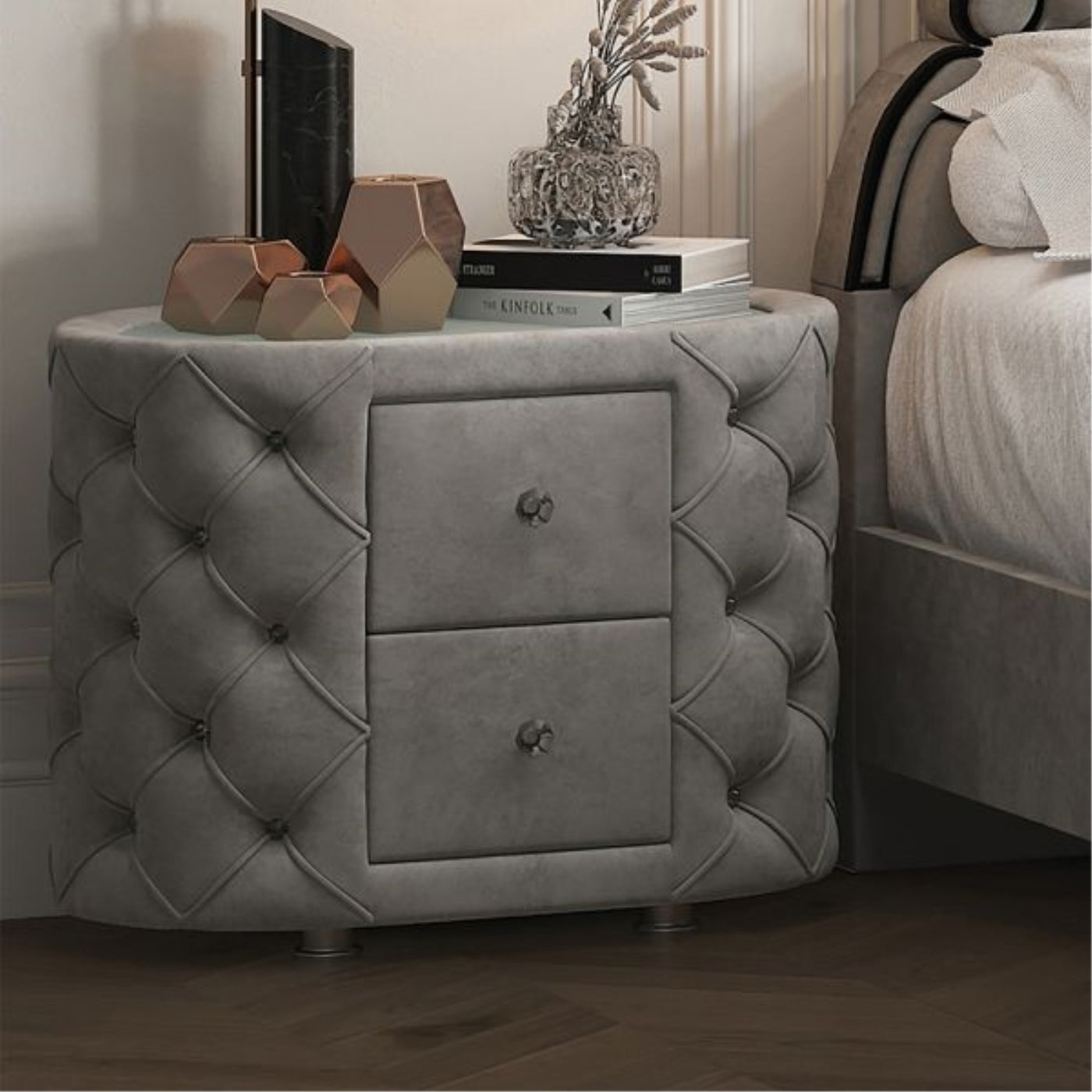 The nightstand is luxuriously designed and upholstered in sumptuous gray velvet. The hardwood wooden frame is designed for long time use. Glistening crystal-like button tufting is carried out through the piece for a regal look. The two-drawer nightstand provides a storage solution for all kinds of necessaries at hand.