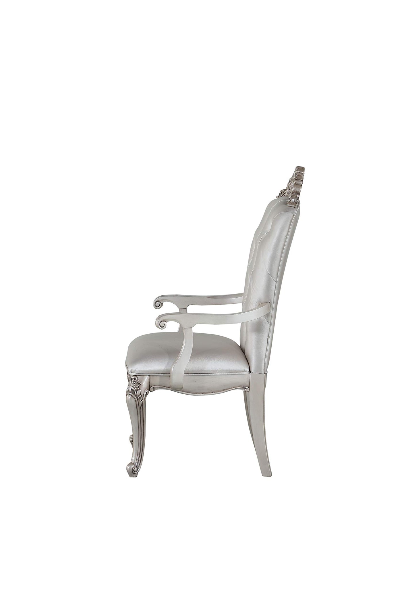 Exclusively designed and filled with romantic spirit, this beautiful chair features Queen Anne legs and carved apron and trim, decorated with raised and scrolled floral motifs in an golden ivory finish. This unique chair is upholstered in a cream fabric with crystal like button tufting back. This stylish and detailed collection is ideal for a large gathering and will add elegance to any dining room décor.