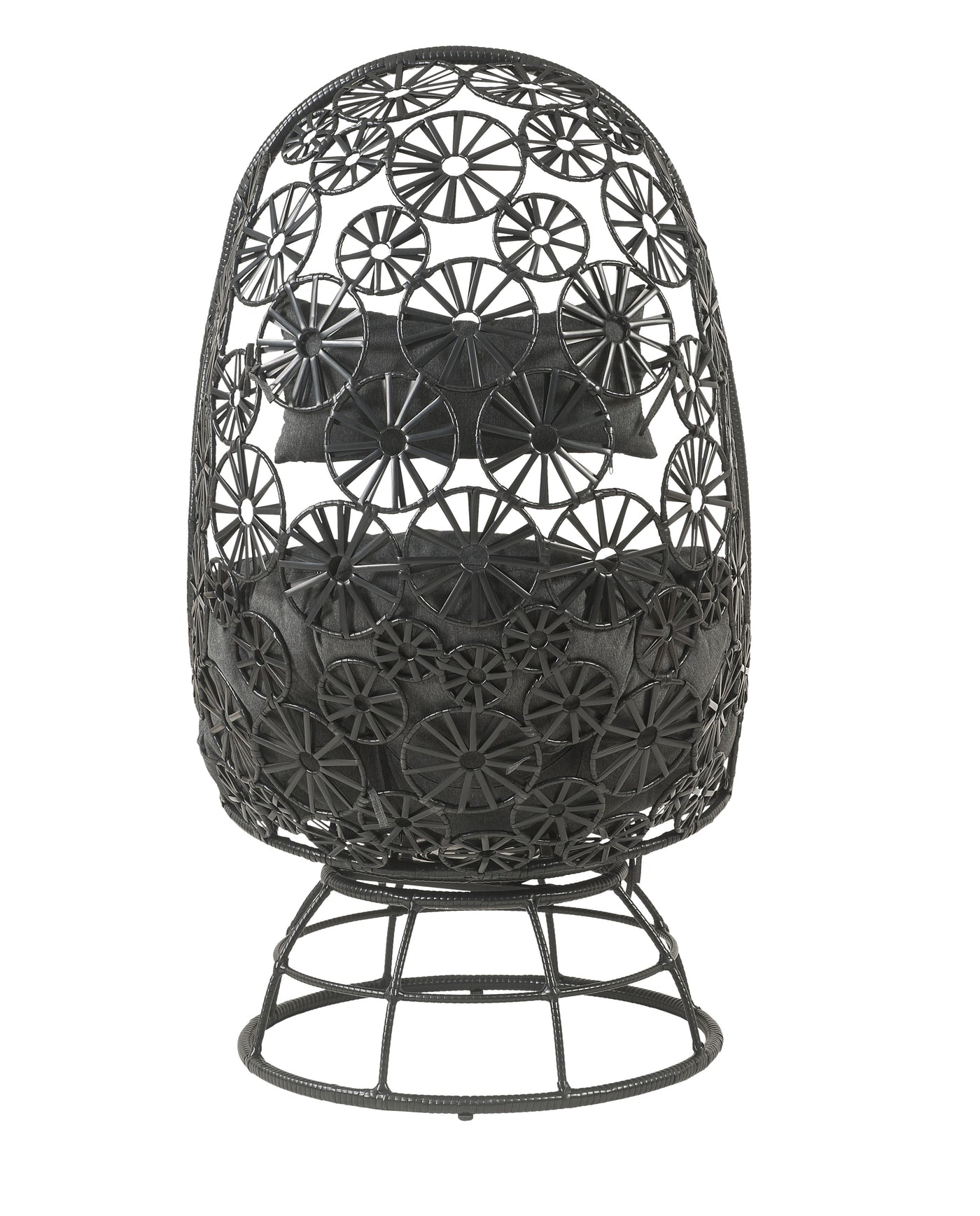 Elegant, airy wicker-weaving work offers a lovely retreat to relax your body and soothe your mind. Black wicker frame with metal base highlights the fabulously airy and sturdy construction. Teardrop-shaped design combines beautiful floral accents to create a sophisticated look. The additional seat cushion will make you feel so comfortable and relaxed lounging in this chair. Complementing side table makes a great place to rest your drink or book with its glass tabletop and stable drum base. Discover a dreamy oasis to stay with Hikre Patio Lounge Chair & Side Table.