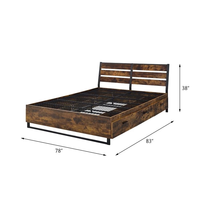 A perfect mixture of industrial vibe and rustic charm, the sturdy metal frame, and warm wooden accents into its design. The brilliant bed is founded atop a strong metal base paired with wooden side rails and a slatted headboard, while six space-saving drawers offer additional storage at the bottom.