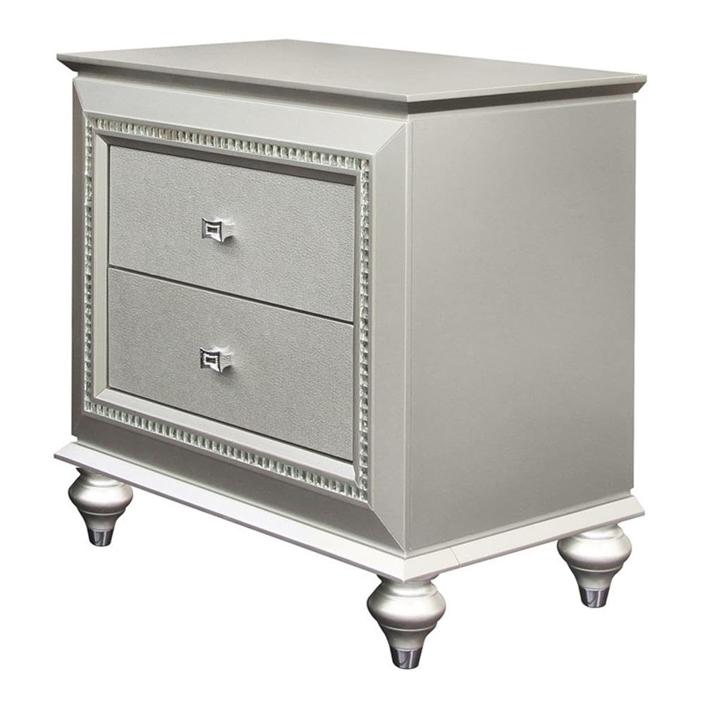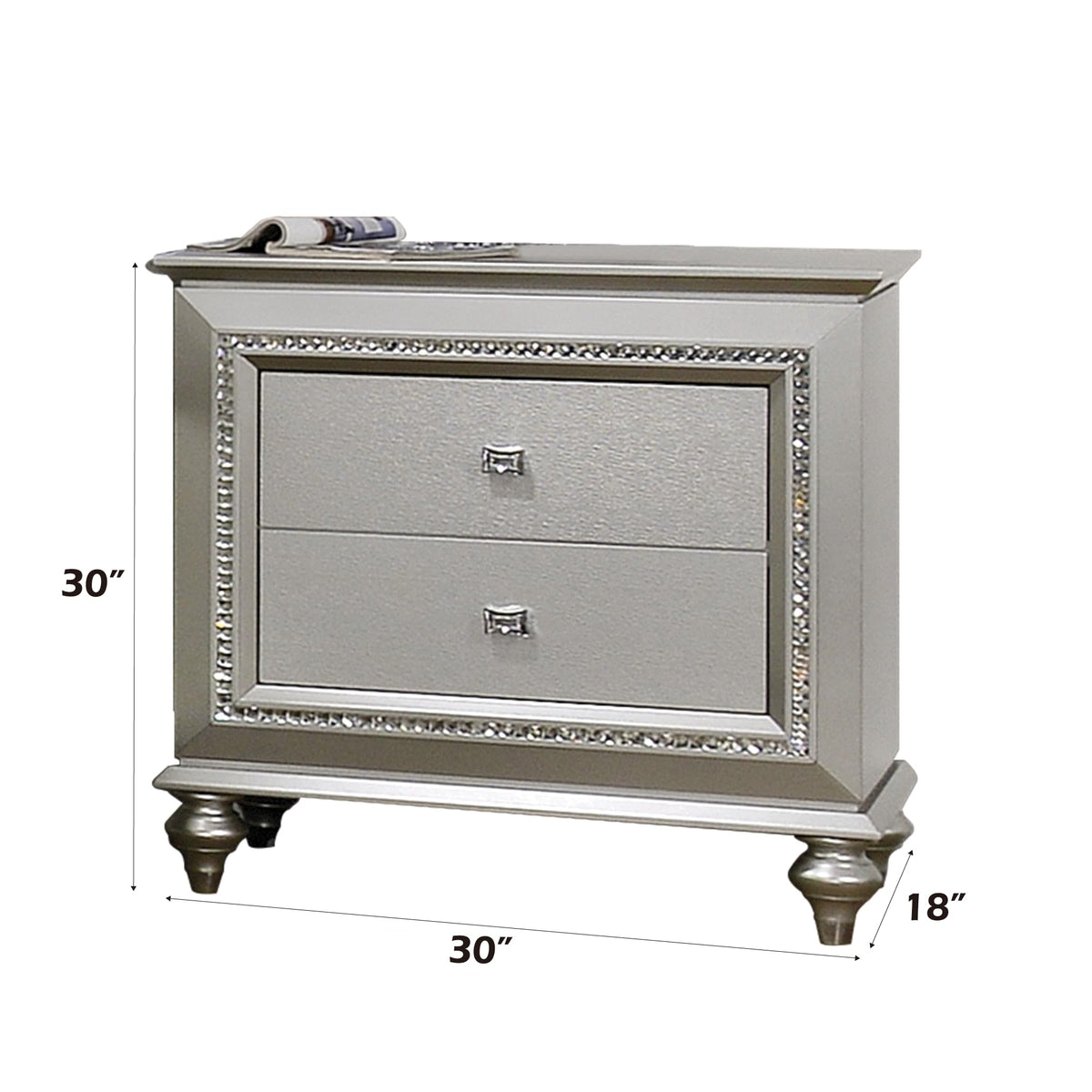 With The Smooth Champagne Finish Of The Solid Woods And Veneer, This Night Stand Offers Two Drawers Which Can Store Samll Things Like Books Or Personal Items. It Also Has Beautiful Bun Feet. Crafted With A Transitional Look That Is An Ideal Addition To Any Bedroom, The Nightstand Is Accented With Textured Front And A Crystal-Like Sparkling Trim. Its Crystal-Like Trimming Creates Dazzling Glow For Your Master Bedroom.Dimension: 30" X 18" X 30"H