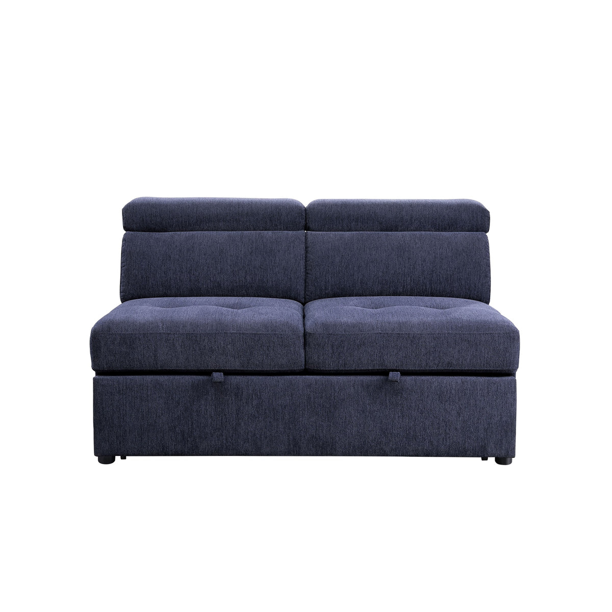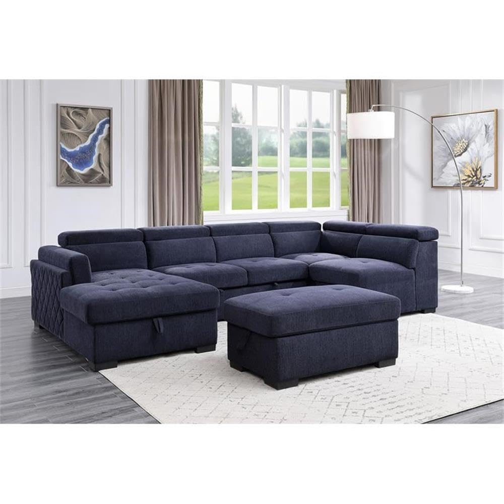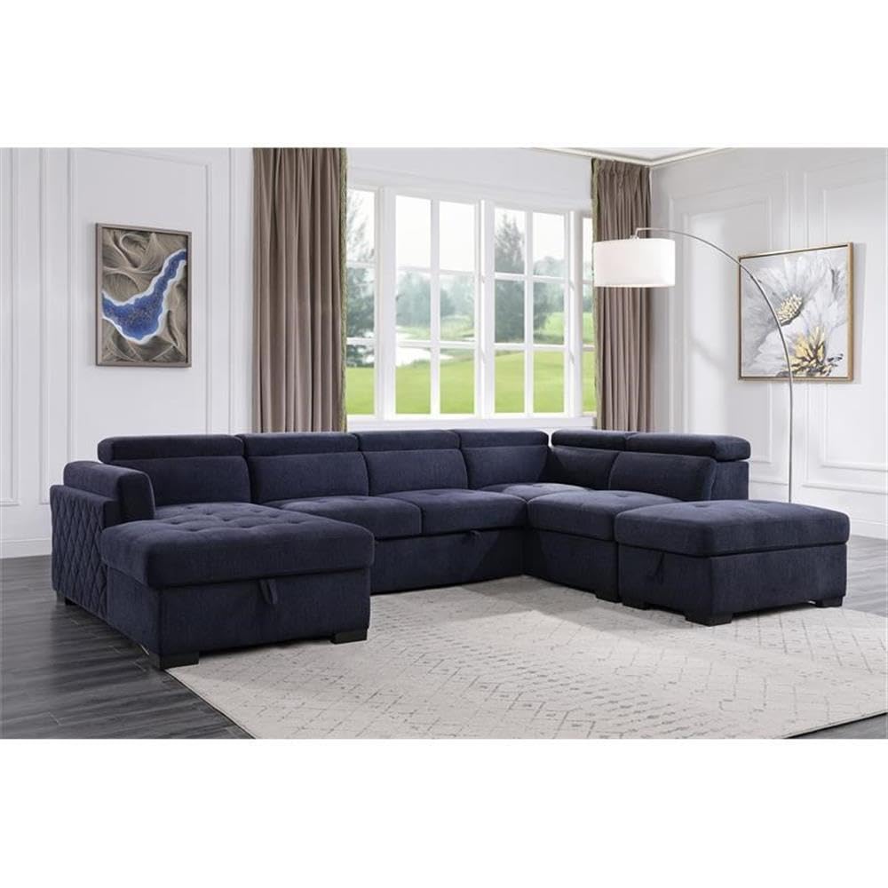 Spend more time with your family on this Nekoda storage sleeper sectional sofa and ottoman. This sofa features adjustable headrests that help elevate the comfort level. Family movie nights are about to be more pleasant with the pull-out bed feature on the loveseat. The button-tufted seat cushions give it a refined look. The chaise and ottoman offer storage to keep blankets and pillows nearby at all times. The navy blue color adds a touch of calmness and serenity. Big enough for the entire family with all the comfort and storage options needed.