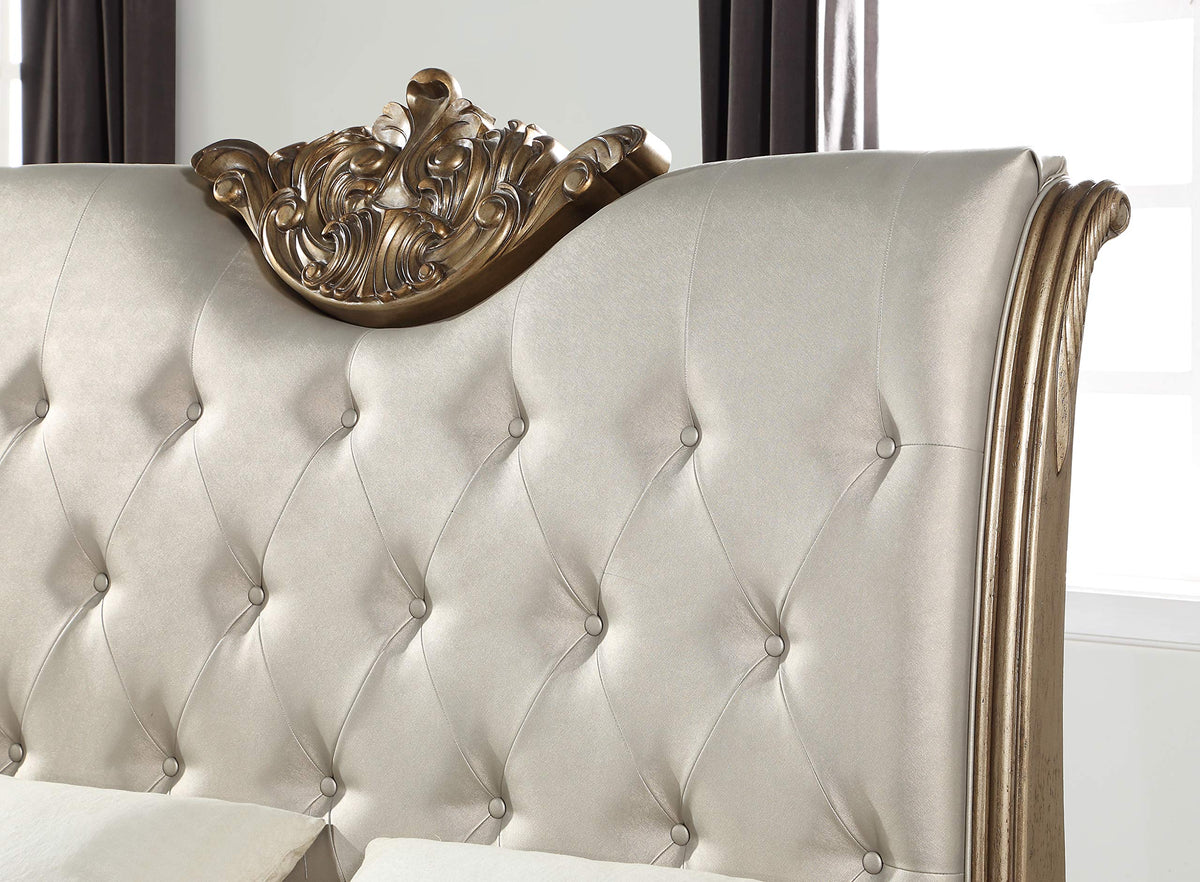 The Orianne queen size bed is exclusively designed and filled with romantic spirit. A piece crafted and inspired by the luxurious designs of the past, this gorgeous sleigh bed features a stunning champagne faux leather headboard and elegant antique gold finish frame. Expertly detailed, this gorgeous bed features a button tufted headboard with elaborate carvings on its wood frame. Accented with scrolled corners, raised crown molding and elegant Queen Anne style legs. This uniquely designed sleigh bed will make a statement in any bedroom.