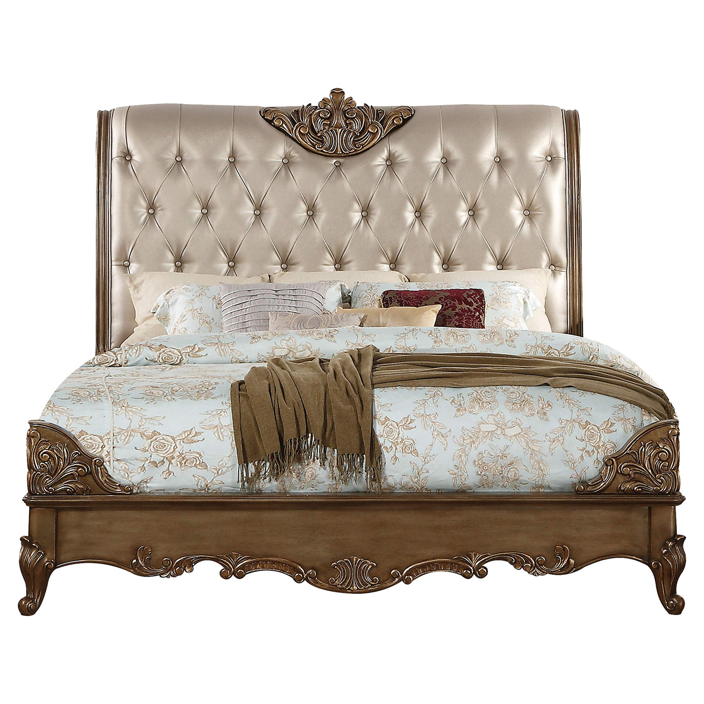 Acme Orianne Queen Bed,Champagne Leatherette and Antique Gold