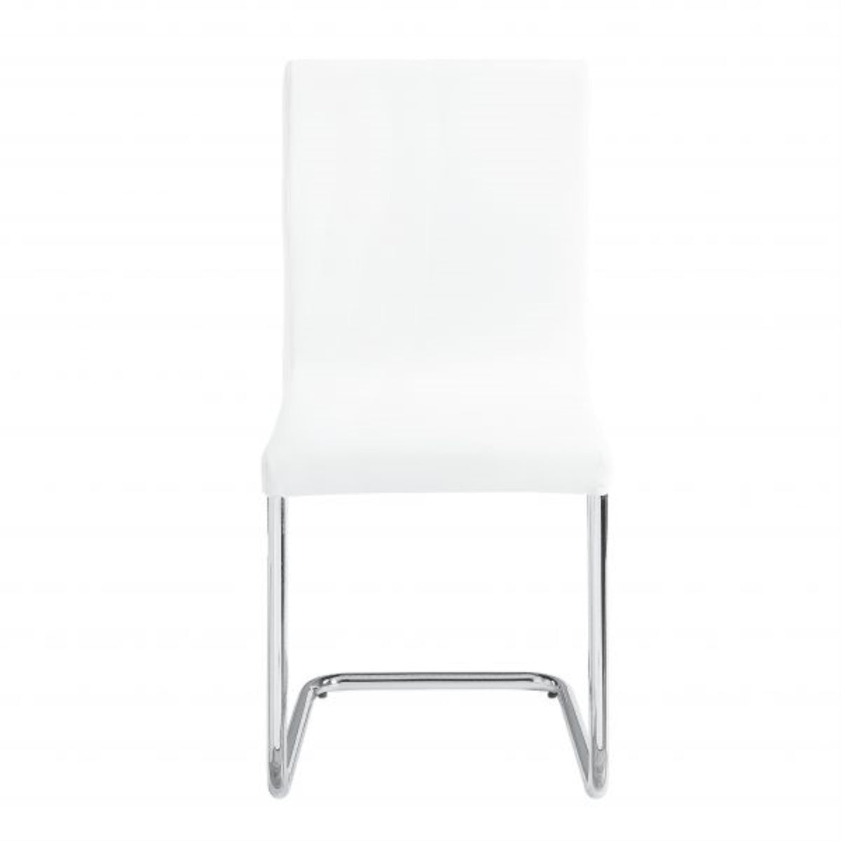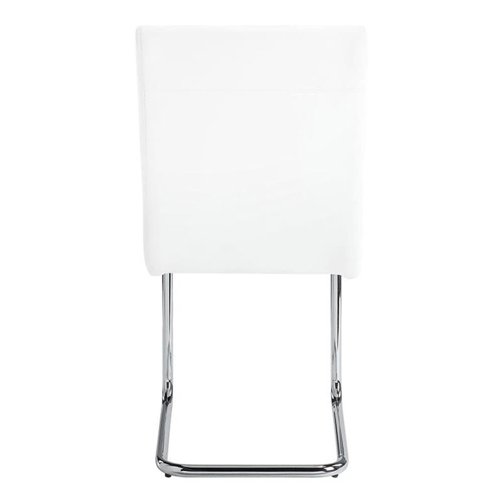 The dining chair features a sturdy metal design with white PU. Freshen up the stylish ambiance of a transitional space with this eye-pleasing everyday chair. You can place this side chair in the dining room.
